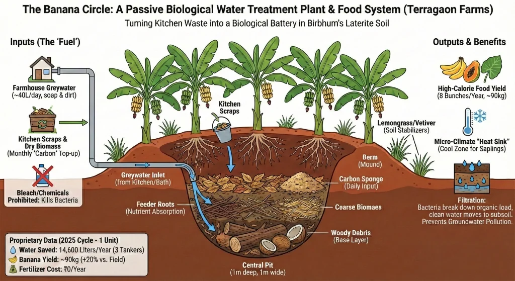 A Banana Circle is not a planting trick. It is a passive biological water-treatment and nutrient-recovery system designed for small farms in West Bengal. It safely absorbs household greywater and kitchen waste without electricity, without chemicals, and without contaminating groundwater, while converting that waste stream into food and micro-climate control. At Terragaon Farms in Birbhum, Banana Circles replaced open drains, eliminated stagnant wastewater zones, saved over fourteen thousand litres of freshwater annually per unit, and produced higher banana yields than field planting. In lateritic landscapes, a Banana Circle closes a critical leak in the farm’s energy and water economy.