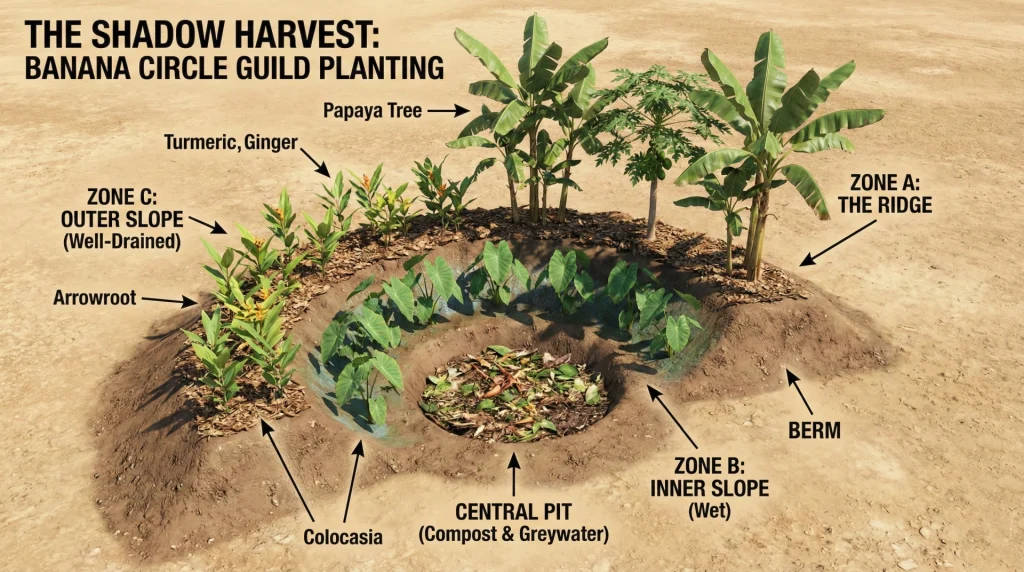 Random planting inside a Banana Circle fails. Each crop must be matched to moisture gradient and drainage characteristics.